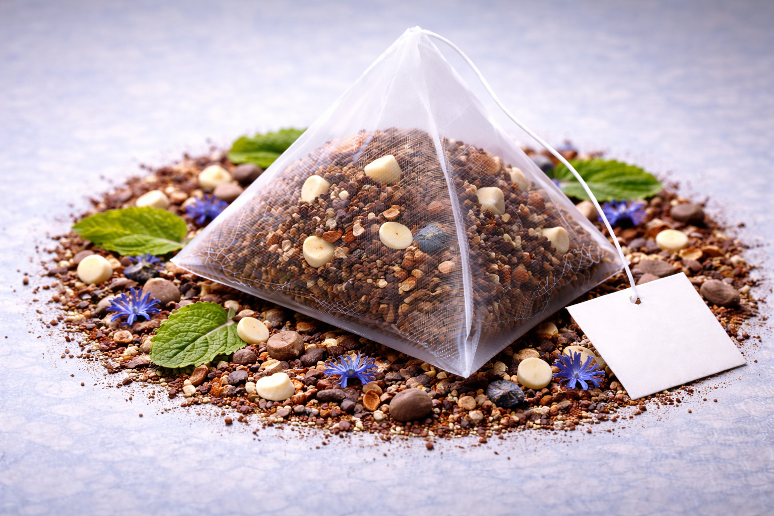 Cocoa nibs, Rooibos tea, Honeybush, Peppermint leaves, Mini white chocolate chips, Spearmint leaves, Chicory, Cinnamon, Licorice, White chocolate flavor, Blue cornflowers